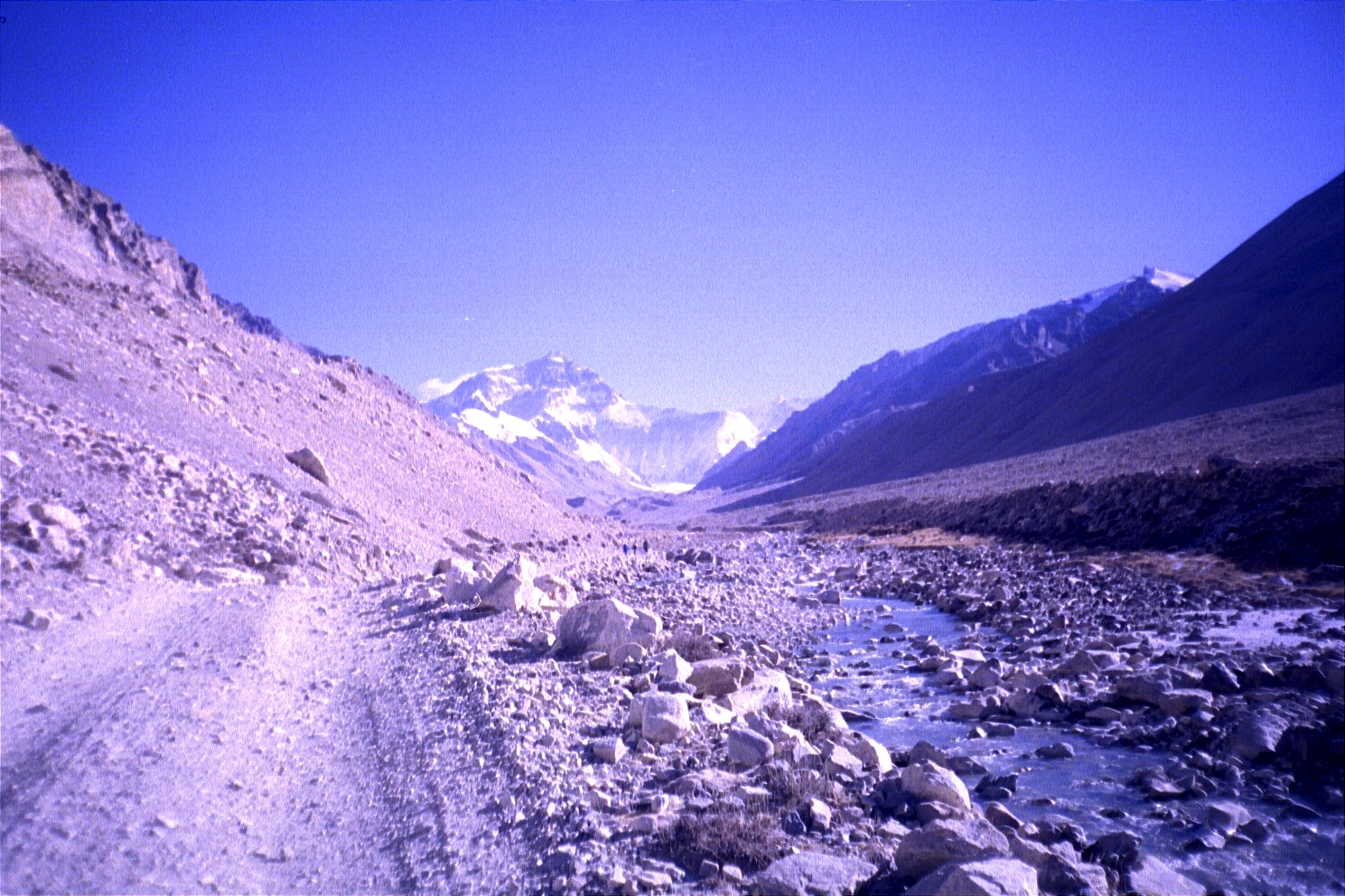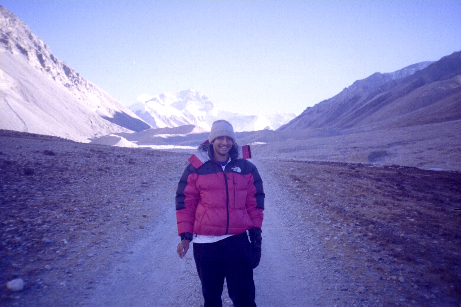 We hit a sheet of ice (on a ridge) that the car couldn't go through around 4p. We then decided to walk the next ten or so miles (starting at about an elevation of 5000 metres/16500 feet) to the base camp marker motivated by great views of Everest!